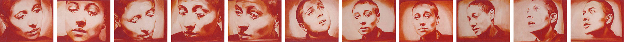 La causa que impedía a la Mujer Elefante poder ver, verse y encontrar su propia voz, era la pérdida de la cabeza y, por tanto, de los sentidos. Ese rostro oculto por la almohada responde ahora a una serie de primeros planos extraídos de la Juana de Arco de Dreyer. Su tormento irá transformándose en una sucesión de gestos conmovedores. Frente al peso del saber cabe oponerse con otra verdad, aunque solo exista fuera de los márgenes de lo visible, como un tímido destello. Su verdad es su palabra, mínima expresión que da sentido a su existencia. Elemento exageradamentedesproporcionado frente al magno discurso, convertido en artillería pesada, de sus oponentes. A pesar del miedo ella no renuncia, no puede fingir, no puede callar, no se deja convencer por retóricas, ni siquiera le disuade la razón a la fuerza, y esa es su lucha: su existencia es su condena. Defender su verdad le dará la vida aunque por ello muera en la hoguera. La indefensa pero insumisa mujer, protagonista de esta trama y de muchas otras, se enfrenta a todos siendo consciente de su fatal destino, y demanda con su vida la obligación de pensar.