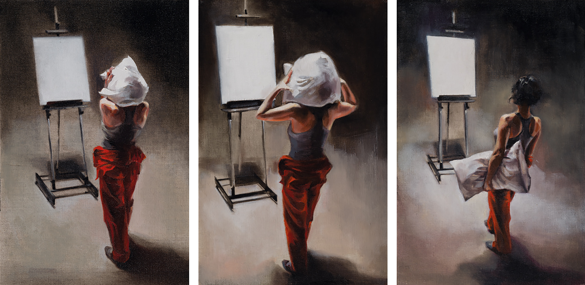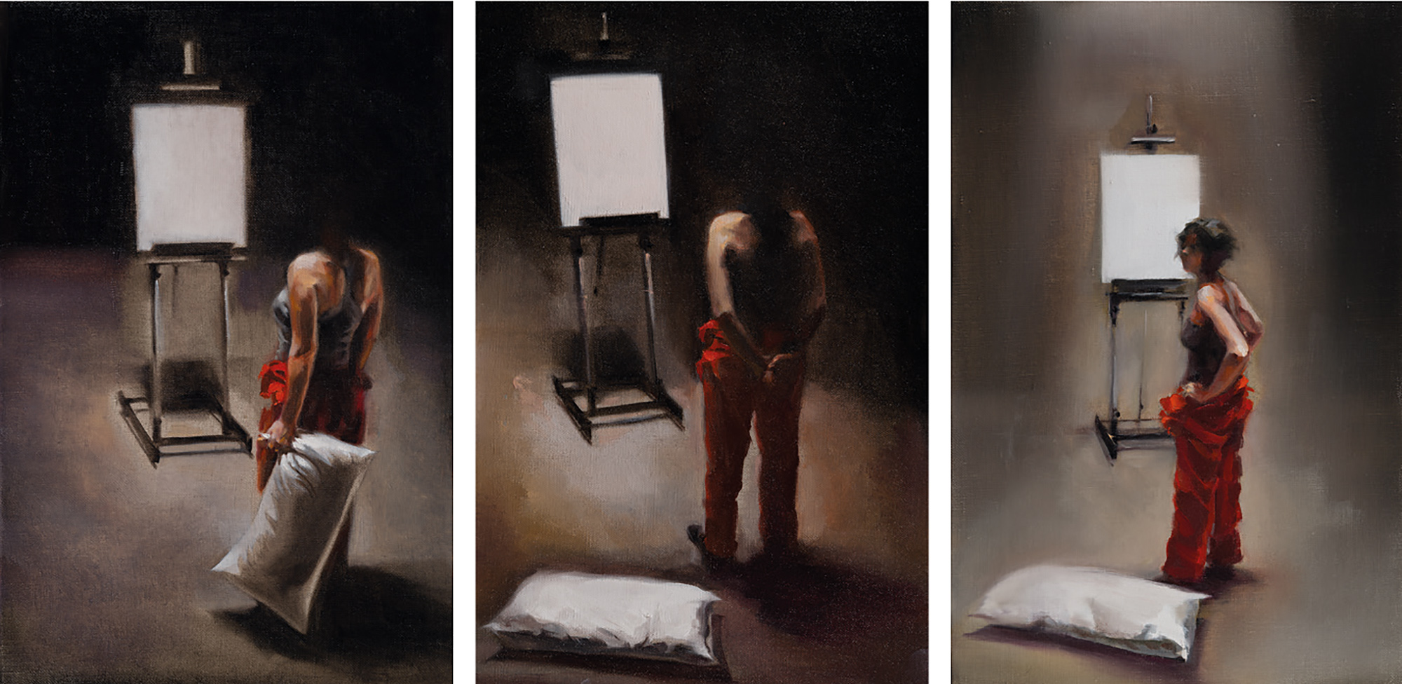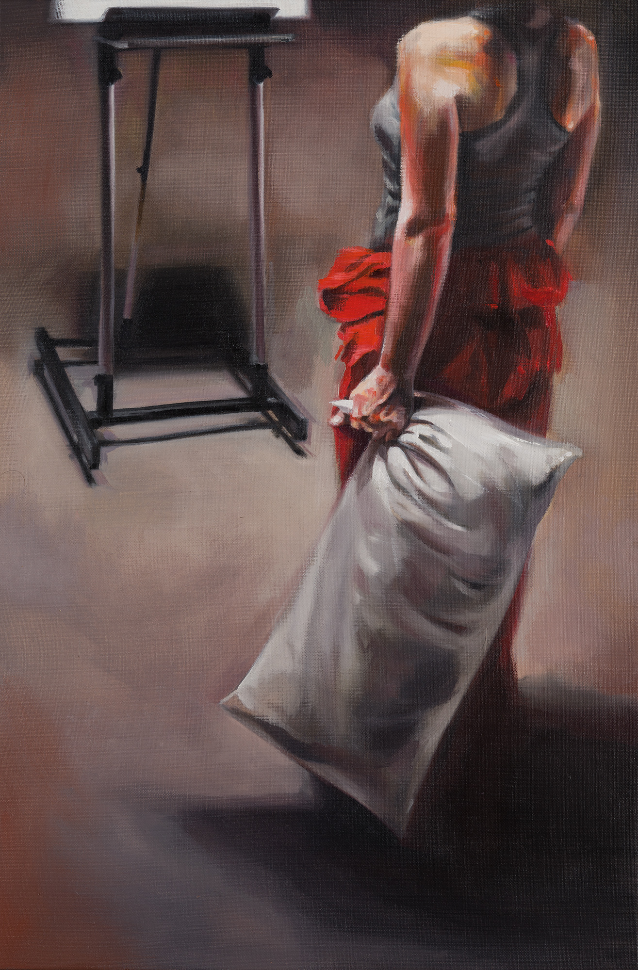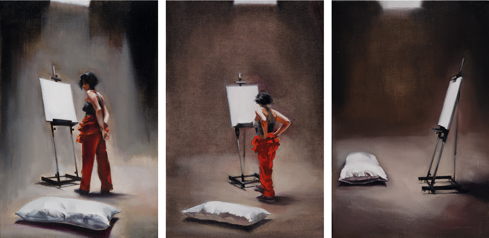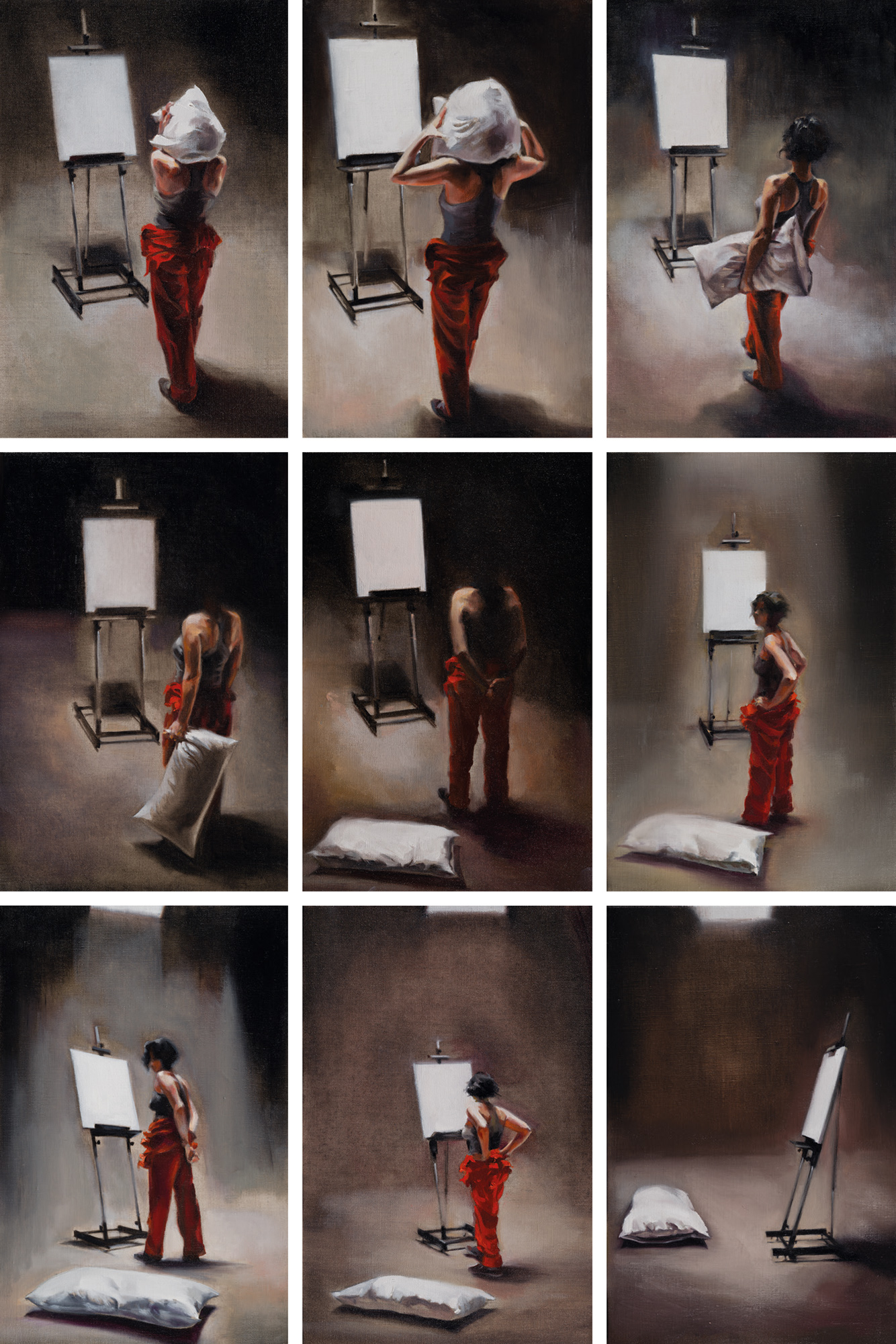 Ante la cuestión general, de quién soy o quiénes somos y qué pintamos en este mundo, surge la necesidad inevitable de aparecer retratada como pintora en los cuadros. Ser mujer en el campo de la creación, ser escritora, filósofa, actriz o, en mi caso, ser pintora, supone interpretar el mundo de otra manera al haber tenido menos referentes y más dificultades. Verse limítrofe genera preguntas, contenidos diferentes y plantea otra forma de contar. Pintar puede ser la expresión de un acto creativo y creador, una pulsión de existencia que hace posible inventarse una salida tras los escombros, a partir de las experiencias observadas o sufridas, sustraídas de la corriente del tiempo. Esta serie de autorretratos, dentro del proyecto Seres fuera de campo, retoma la figura de la Mujer elefante y utiliza la almohada, entre otras metáforas, como aquello que nos pesa y debemos soltar para vernos, reconocernos y avanzar: después del escombro está todo por hacer. La pintora representa a la propia pintura, la que mira y es mirada al mismo tiempo, y aparece ante un lienzo en blanco, en medio de la oscuridad, con un mono de trabajo de color rojo. Desde la piel de la pintura, la pintora va evolucionando a lo largo de una serie de escenas hasta transfigurarse en la piel de sus verdaderas protagonistas, otra serie en marcha de parias conscientes que encarnan la misma pregunta.