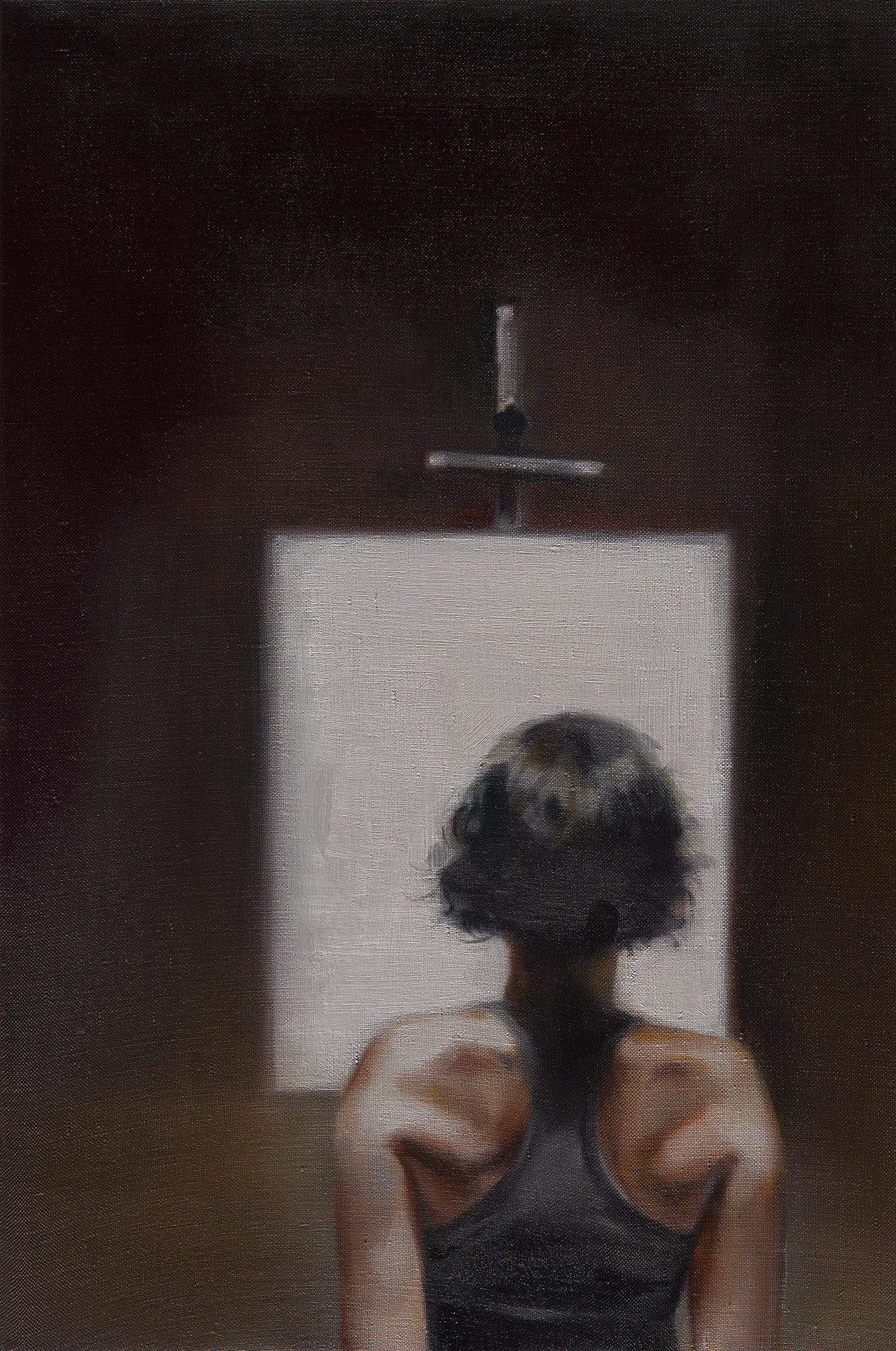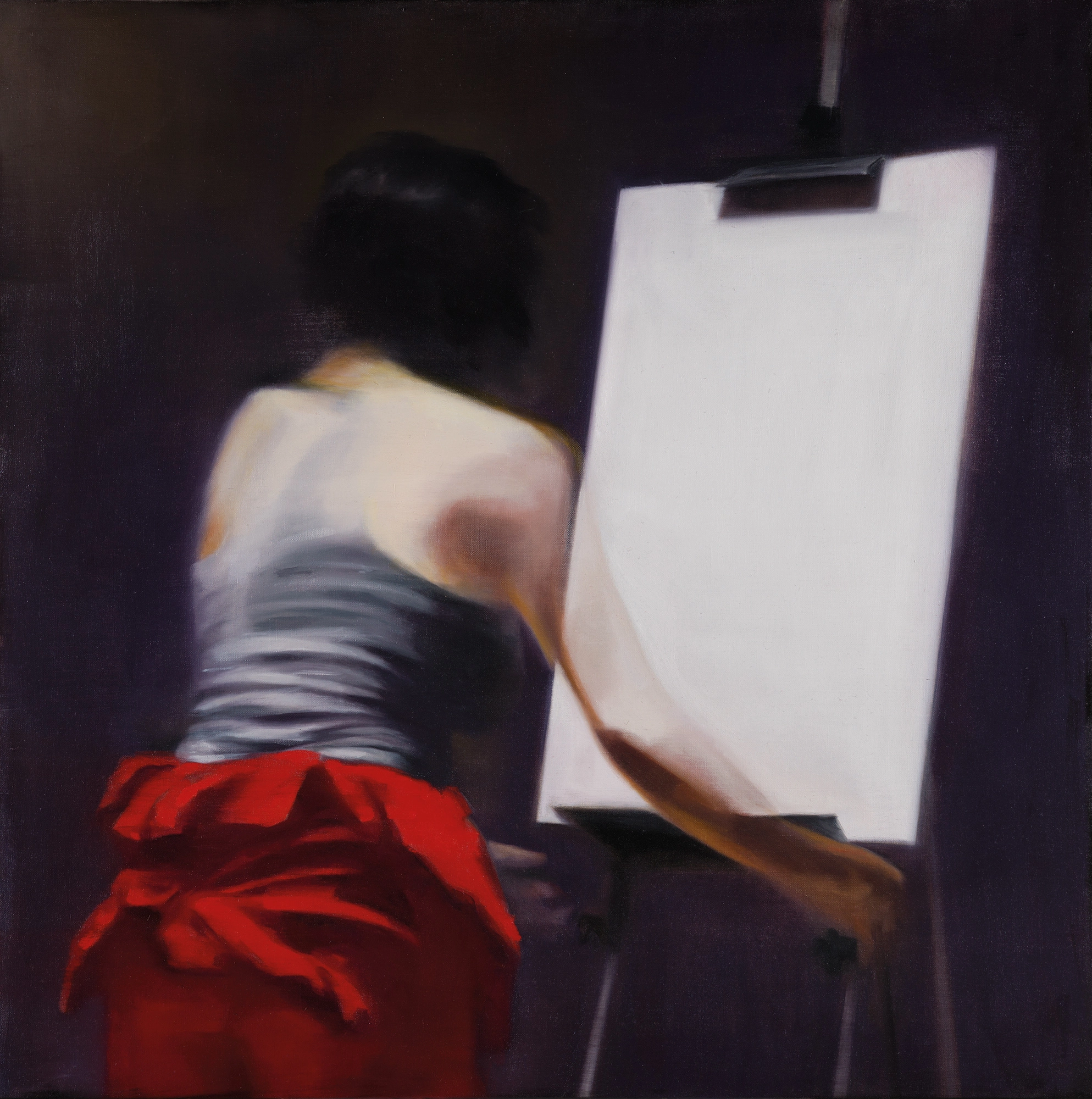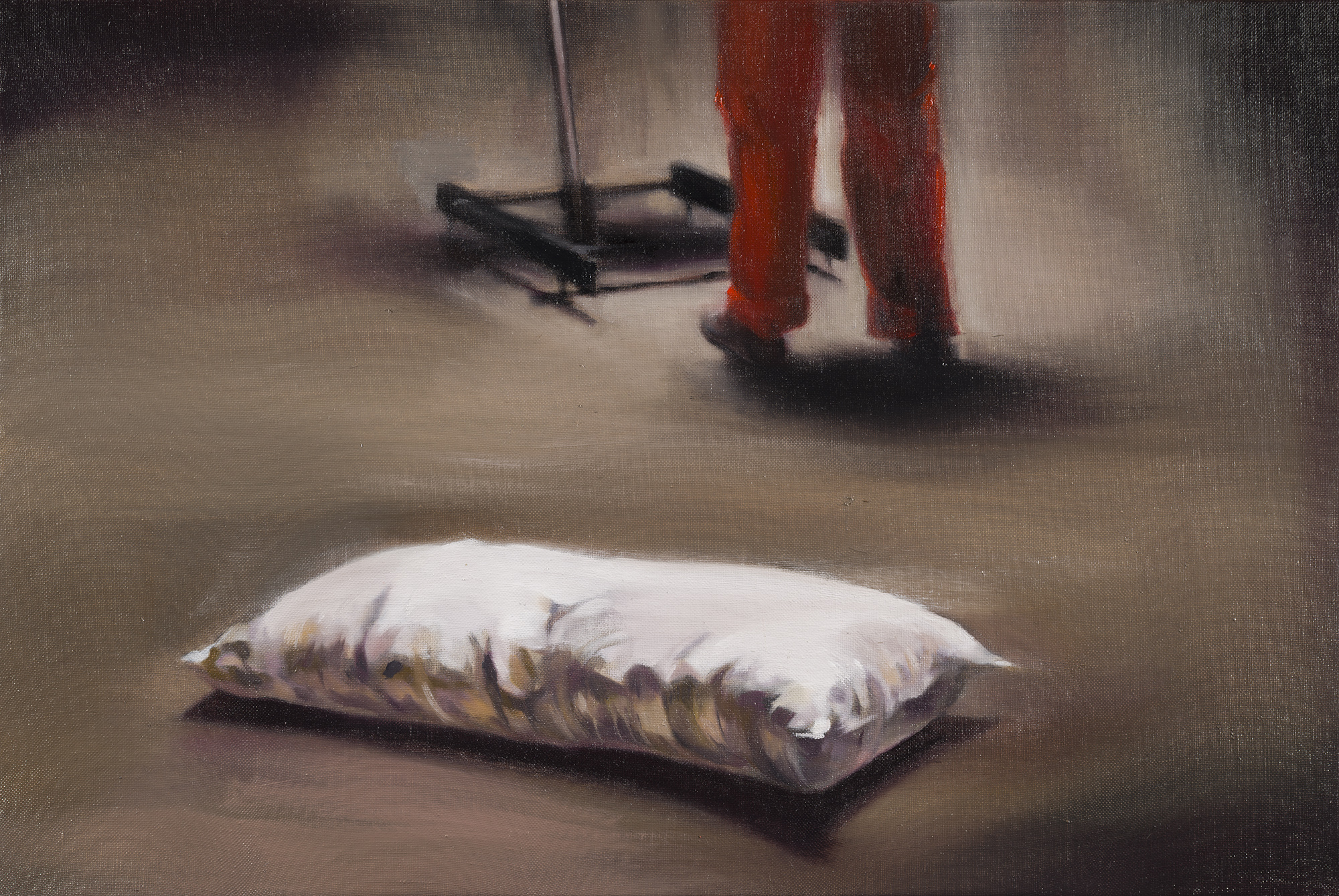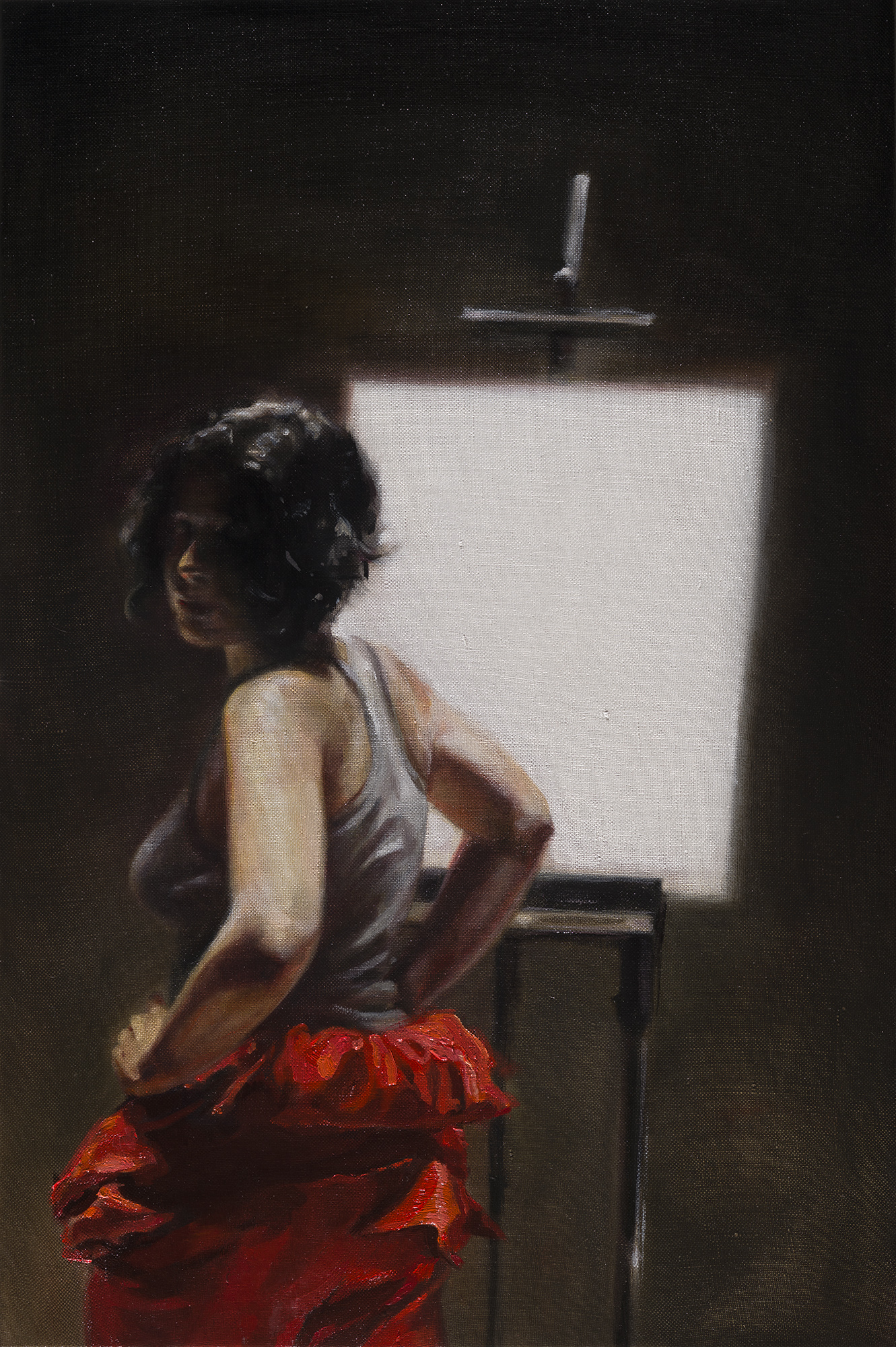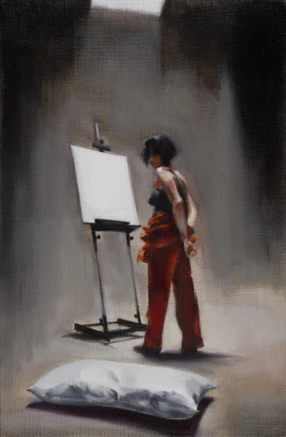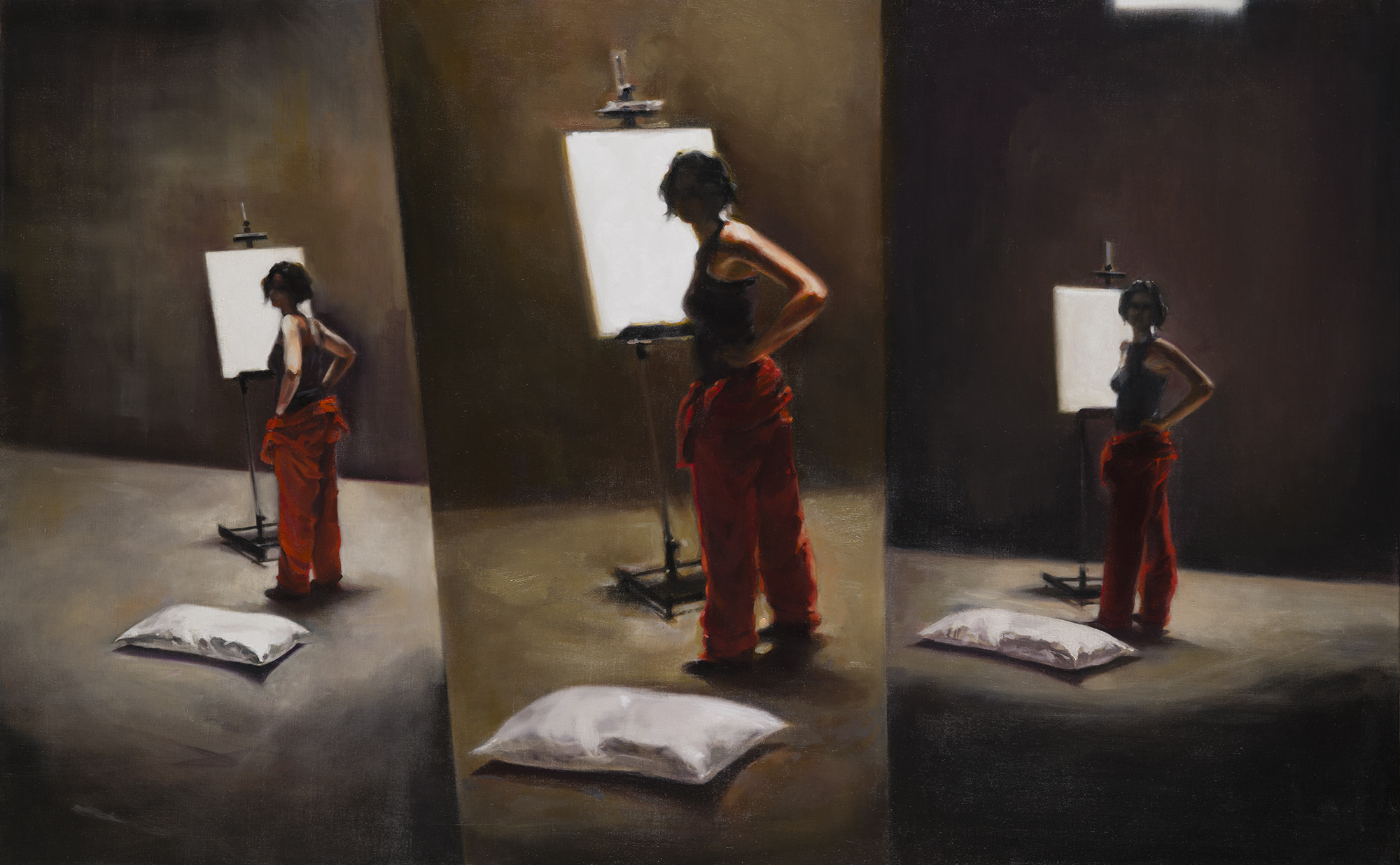 Ante la cuestión general, de quién soy o quiénes somos y qué pintamos en este mundo, surge la necesidad inevitable de aparecer retratada como pintora en los cuadros. Ser mujer en el campo de la creación, ser escritora, filósofa, actriz o, en mi caso, ser pintora, supone interpretar el mundo de otra manera al haber tenido menos referentes y más dificultades. Verse limítrofe genera preguntas, contenidos diferentes y plantea otra forma de contar. Pintar puede ser la expresión de un acto creativo y creador, una pulsión de existencia que hace posible inventarse una salida tras los escombros, a partir de las experiencias observadas o sufridas, sustraídas de la corriente del tiempo. Esta serie de autorretratos, dentro del proyecto Seres fuera de campo, retoma la figura de la Mujer elefante y utiliza la almohada, entre otras metáforas, como aquello que nos pesa y debemos soltar para vernos, reconocernos y avanzar: después del escombro está todo por hacer. La pintora representa a la propia pintura, la que mira y es mirada al mismo tiempo, y aparece ante un lienzo en blanco, en medio de la oscuridad, con un mono de trabajo de color rojo. Desde la piel de la pintura, la pintora va evolucionando a lo largo de una serie de escenas hasta transfigurarse en la piel de sus verdaderas protagonistas, otra serie en marcha de parias conscientes que encarnan la misma pregunta.
